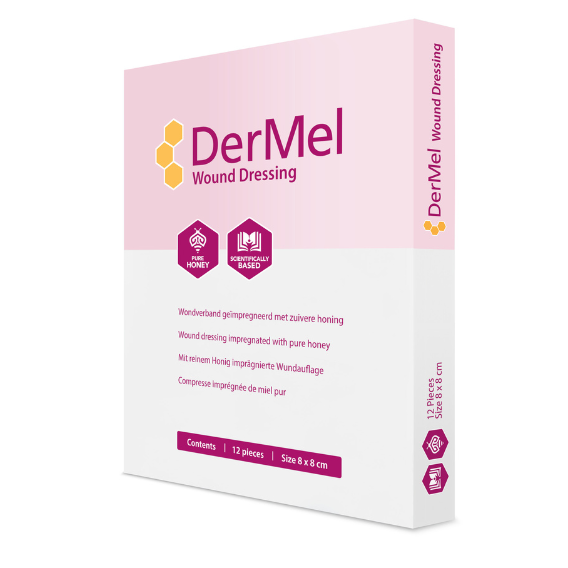 Het DerMel wondverband is een steriel wondgaas op basis van zuivere honing. Het stimuleert wondgenezing en is zeer patiëntvriendelijk. Ook biedt DerMel wondverband antibacteriële bescherming.